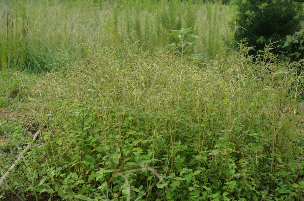 雑草が勢いを増す畑の中に、1つだけ見つけたひまわりの芽らしきもの。